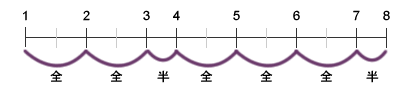 メジャー・スケールにおいて、それぞれの音は半音と全音が特定のルールに沿って並びます。半音とは、ある音から次に最も近い音までの距離のことです。たとえばピアノの鍵盤上で、あるキーの真隣(黒でも白でもとにかく一番近いほう)のキーまでの距離、それが半音です。全音とは半音2つ分と同じです。 メジャー・スケールの音階を作るには、どの音から始めるにしても次のような全音と半音の組み合わせで音を並べてください。 例: